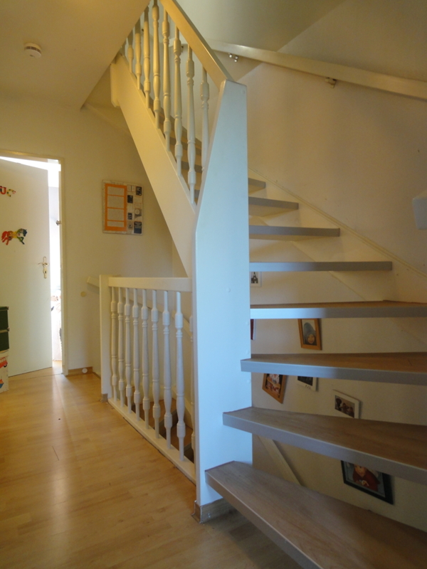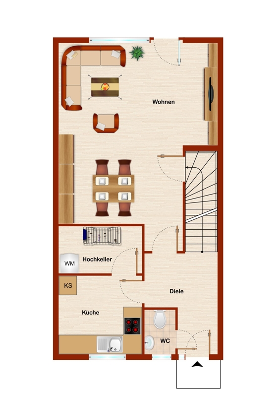 Die Küche mit angrenzendem Hauswirtschaftsraum könnte ggf. geöffnet werden. Somit könnte man eine größere Küche schaffen, oder evtl. sogar eine zum Wohnbereich offene Küche.