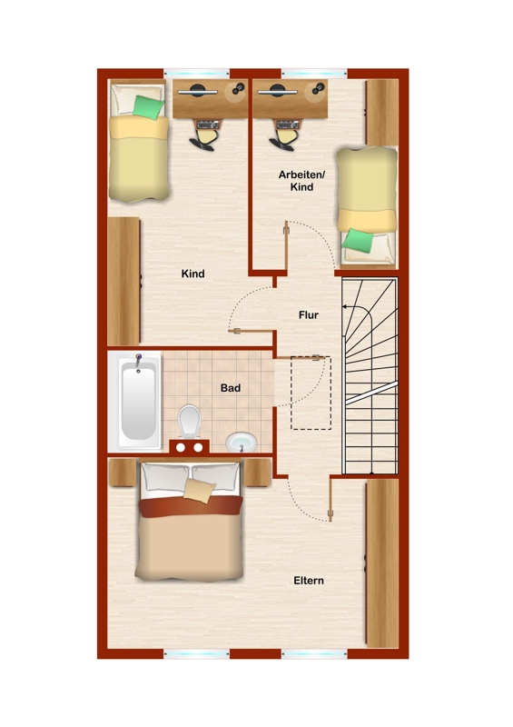 Im Obergeschoß bieten 3 Schlafräume Platz für die Kinder und Gäste. Hier ist auch das Hauptbad mit Badewanne.