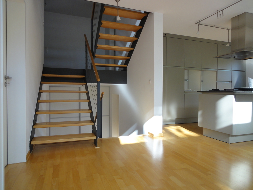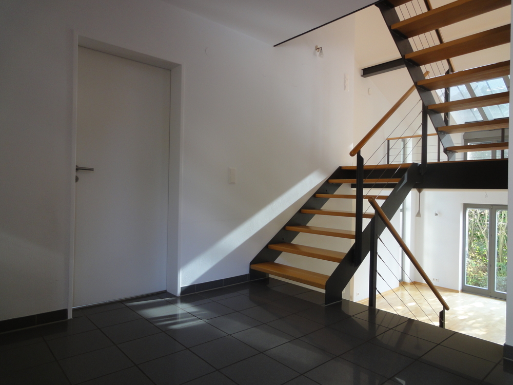 Die moderne Stahltreppe verbindet die verschiedenen Ebenen miteinander, im Ergeschoß befindet sich der Eingangsbereich, ein Arbeits- oder Gästezimmer, sowie ein Gäste Bad mit Dusche.
