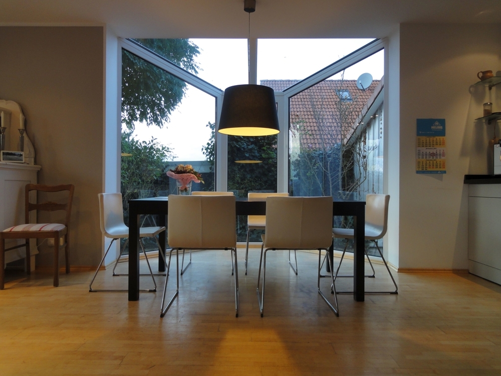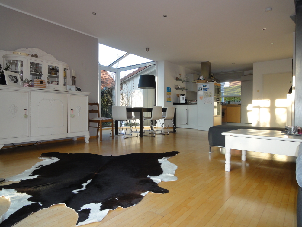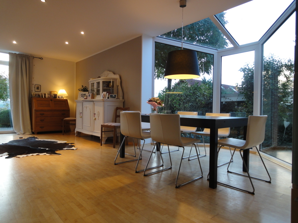 Der großzügige Wohn- Essbereich mit offener Einbauküche ist das Herzstück des Hauses, und der verglaste Erker sorgt für viel Tageslicht und verleiht dem Raum einen besonderen Charakter.