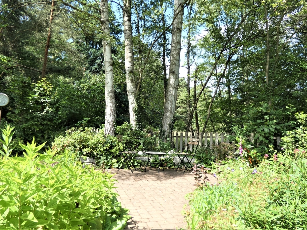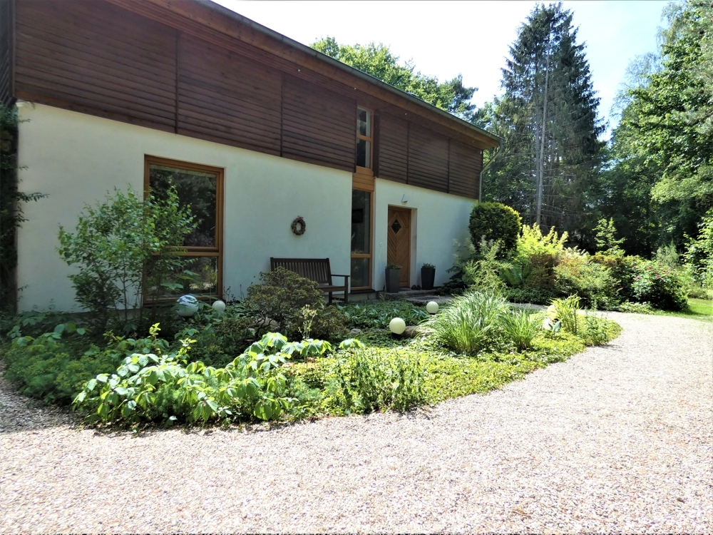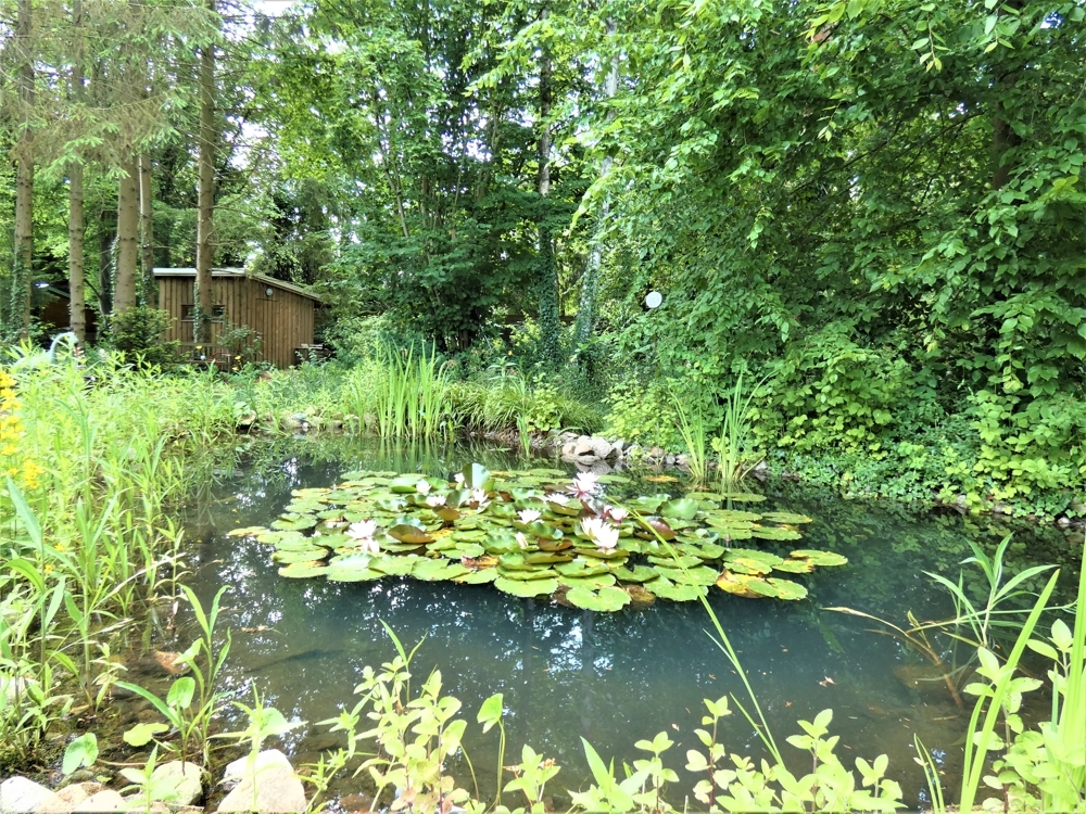 Der wunderschön angelegte Garten bietet zahlreiche Ruhezonen und Terrassen, z.B eine Terrasse am kleinen Teich oder die große Terrasse direkt am Haus. Eine weitere Terrase befindet sich direkt vorm Essbereich.