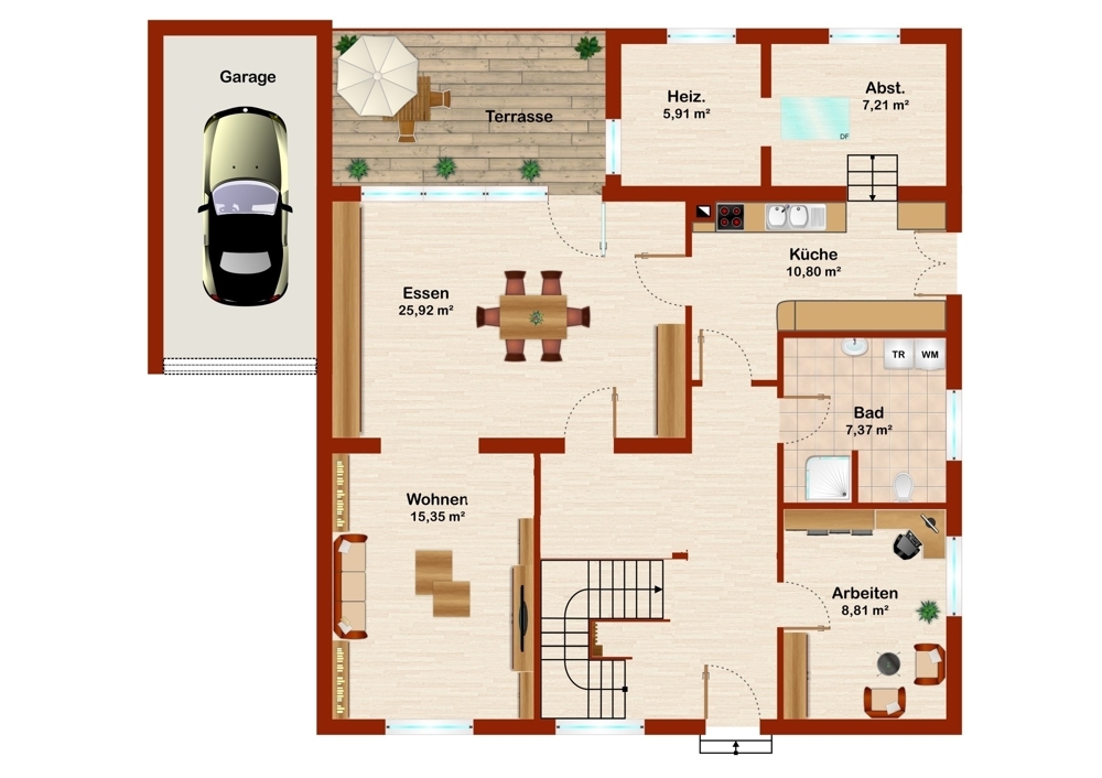 Im Erdgeschoß stehen neben dem großen Wohn-/Essbereich noch eine Einbauküche, ein Gäste Bad mit Dusche und ein Arbeitszimmer zur Verfügung.